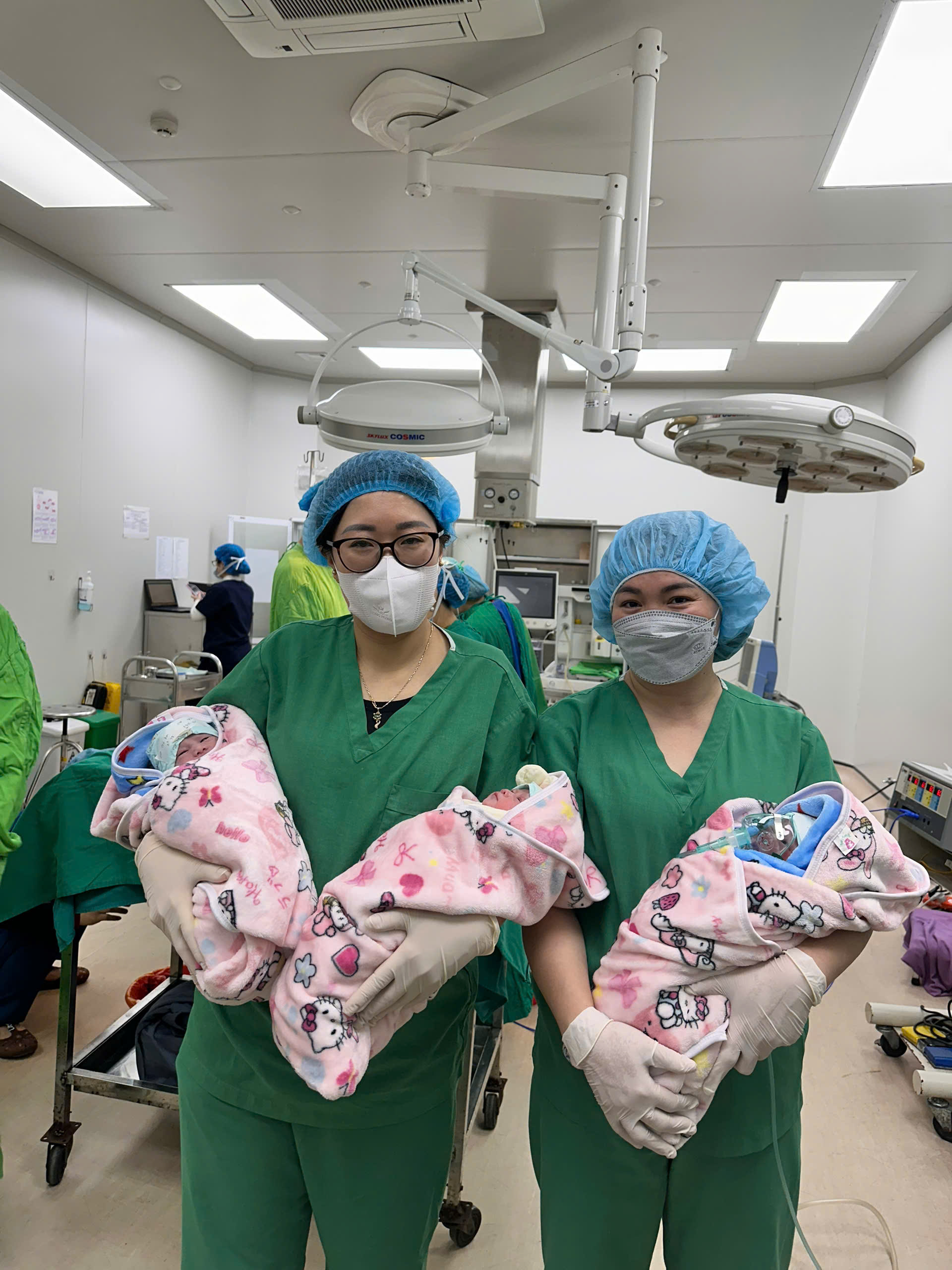 Ca phẫu thuật thành công, 3 bé gái cất tiếng khóc chào đời, cân nặng các bé lần lượt là 1600g, 1800g, 2100g. Hiện tại, các bé đang được theo dõi và chăm sóc tại khoa Nhi.
