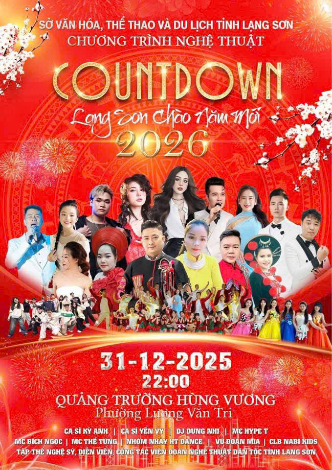 Chương trình do Sở Văn hóa, Thể thao và Du lịch tỉnh Lạng Sơn tổ chức, diễn ra từ 22h00 ngày 31.12.2025 đến 0h15 ngày 01.01.2026, tại sân khấu đường Hùng Vương, phường Lương Văn Tri.